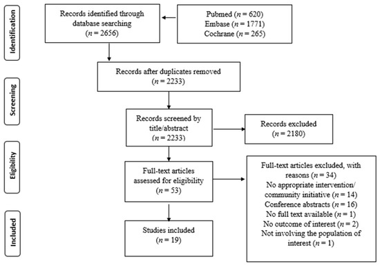 Our search strategy found a total number of 2656 articles. Figure 1 presents the results of the screening process, after which 19 studies [14,15,16,17,18,19,20,21,22,23,24,25,26,27,28,29,30,31,32] were included in this scoping review (Table 1).