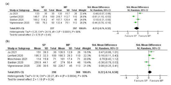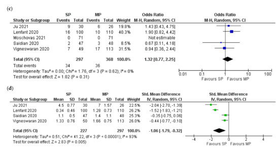 LHS was significantly shorter in the SP group based on the pooled analysis of four studies with 524 patients [9,10,16,17] (Z = 2.83; p = 0.005; 95% CI −1.79:−0.32) (Figure 2d).