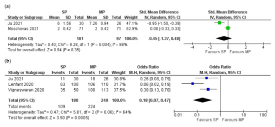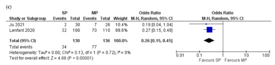 Based on the available data, postoperative pain was compared using pain score, number of pain-free patients, and requirement for opioids. From the combined analysis of two studies with 198 patients [10,11], the difference in pain score was non-significant (Z = 0.94; p = 0.35; 95% CI −1.37:0.48). In the pooled analysis of three studies [9,10,16], only 60.6% of SP patients (109/180) required analgesia compared to 90% (224/249) of MP patients (Z = 3.50; p = 0.0005; 95% CI 0.07:0.47). Opioid administration was also significantly lower in SP patients: 26.2% (34/130) vs. 56.6% (77/136) [9,10], (Z = 4.90; p < 0.00001; 95% CI 0.15: −0.44) (Figure 3).