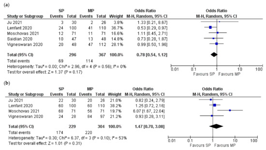 Pooled analysis for PSM was the only feasible comparison to assess the oncological outcomes. SP displayed a trend toward a lower percentage of PSM but could not reach a significant level. It was 23.3% (69/296) for SP vs. 31% (114/367) for MP [9,10,11,16,17] (Z = 1.39; p = 0.16; 95% CI 0.54:1.11) (Figure 4a).