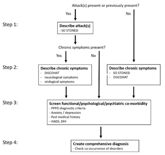 Each step investigates different aspects of vestibular disorders: (1) attacks of vertigo and/or dizziness (=acute and/or episodic vestibular syndromes); (2) chronic vestibular symptoms (=chronic vestibular syndromes); (3) functional/psychological/psychiatric co-morbidity; (4) co-occurrence of various vestibular disorders. This systematic approach increases the chance of detecting the presence of multiple disorders, each with their own symptom profile (especially when practiced by less experienced clinicians, such as residents).