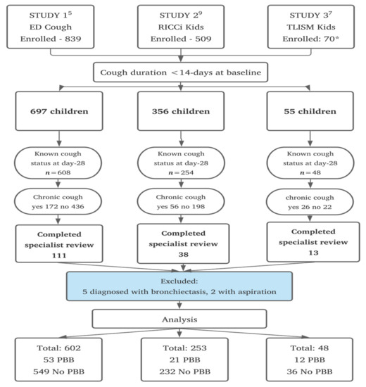Studies examining risk factors for chronic cough generally in children post-ARIwC are limited. To our knowledge, this is the first study to examine risk factors for the development of PBB post-ARIwC in children. Furthermore, it is important as it fulfills a clinical-research gap identified by the ERS PBB task force [2]. PBB was the most common diagnosis amongst all children reviewed by clinicians following identification of chronic cough post-ARIwC in the three primary studies on which this analysis was based [6,8,10]. This is consistent with Australian data, where PBB is also amongst the most common diagnoses in children with established chronic cough referred to tertiary pediatric respiratory clinics, particularly in younger children [1,13,14,15,16,17,18]. An advantage of our study is most studies of chronic cough in children are based on those referred to specialist centers, often after long durations of cough [1,13,14,15,16,17,18]. Identifying, diagnosing, and treating chronic cough and PBB early in the illness improves clinical outcomes [10]. Our study enrolled children early in an ARIwC, and 22% of children diagnosed with PBB had a dry cough at baseline, suggesting an early transition from dry to wet cough that persisted. The rapid assessment and treatment of these children are important for preventing adverse sequelae and improving the quality of life of children and their carers. Additional strengths of our study are that all three included studies employed identical methods to determine cough persistence in children following acute presentation to healthcare and the inclusion of both PHC and ED sites. Furthermore, pediatric pulmonologists established PBB diagnosis following evidence-based guidelines [11,12] and algorithms [13].