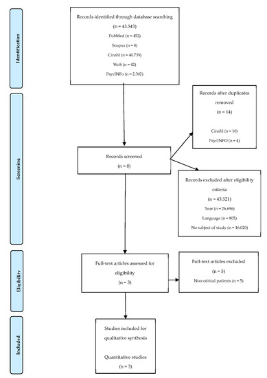 The initial search generated 45,543 results. After eliminating those written prior to 2015, those not written in Spanish or English, and articles that did not deal with the handover of critical patients in an emergency setting, the results were narrowed to eight [24,25,26,27,28,29,30,31]. After exhaustive reading, five were excluded [25,26,27,28,30] as the handover did not take place in the study setting. Finally, three articles [24,29,31] were included in the systematic review. The PRISMA flow diagram graphically describes the results selection process (Figure 1).