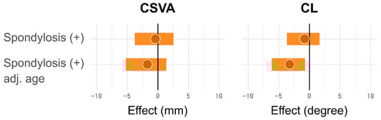 Impact of cervical spondylosis on cervical alignment parameters. Note: Bands represent 95% confidence interval. Abbreviations: CSVA, cervical sagittal vertical axis; CL, cervical lordosis; adj. age, multivariate analysis adjusted by age.