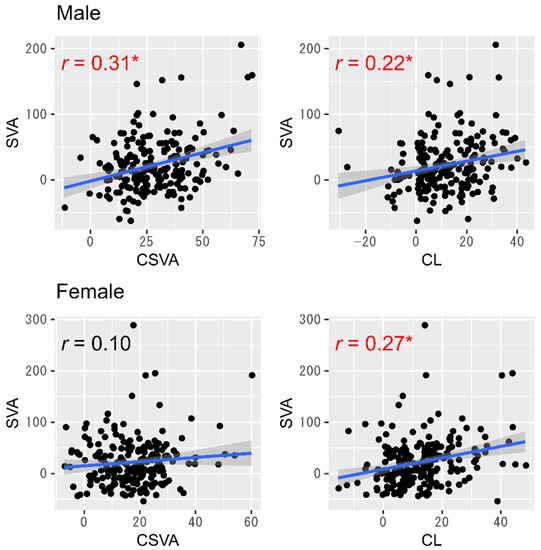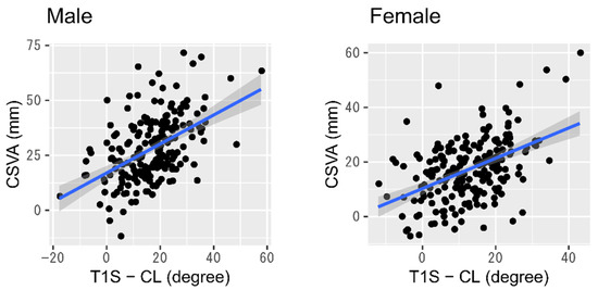 T1S minus CL displayed a significant moderate positive correlation with CSVA in both genders (Pearson correlation coefficient: 0.49 for males and 0.48 for females, both p < 0.01) (Figure 2). Only in males, however, did both CSVA and CL show mild positive correlations with SVA independently of age (Figure 3 and Table 3).