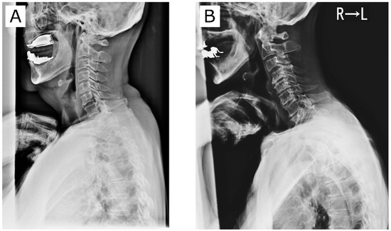 Effect of cervical spondylotic changes on cervical spine alignment. Notes: Case (A) (female) has a compensated cervical spine. Case (B) (male) has a decompensated cervical spine.