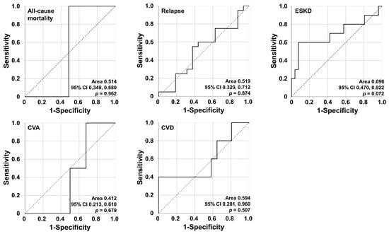 Among the five poor outcomes, only ESKD showed relative significance in the area under the curve in the ROC analysis (area 0.696, p = 0.072). Therefore, this study defined ESKD as the target poor outcome as mentioned in the methods section (Figure 2).