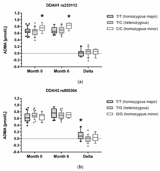- Maas, R.; Erdmann, J.; Lüneburg, N.; Stritzke, J.; Schwedhelm, E.; Meisinger, C.; Peters, A.; Weil, J.; Schunkert, H.; Böger, R.H.; et al. Polymorphisms in the promoter region of the dimethylarginine dimethylaminohydrolase 2 gene are associated with prevalence of hypertension. Pharmacol. Res. 2009, 60, 488–493. [Google Scholar] [CrossRef] [PubMed]