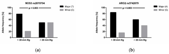 Relationship of genotypes of (a) NOS3 rs2070704, (b) ARG2 rs3742879, (c) DDAH1 rs233112, and (d) AGXT2 rs37369 with high-altitude pulmonary hypertension. Mean pulmonary arterial pressure was estimated by echocardiography after 6 months of chronic intermittent hypoxia in n = 24 individuals. Allele frequencies were analysed in individuals with (i.e., mPAP ≥ 30 mm Hg) or without high-altitude pulmonary hypertension (i.e., mPAP < 30 mm Hg). Data given are relative allele frequencies of the genes indicated. p values indicate significances in χ2 test after adjustment for multiple testing.