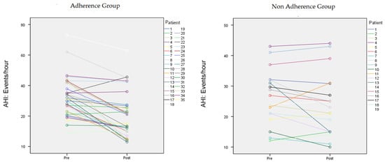 | AHI/h | 25.5 ± 9.2 | 23.8 ± 10.1 | n.s | 32.97 ± 1.8/h | 21.9 ± 14.5/h | 0.01 |