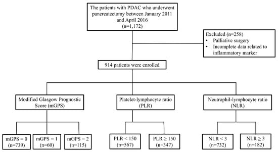 Of the 1172 patients, 914 who underwent curative pancreatic surgery with complete preoperative laboratory profiles related to inflammation-based prognostic scores were included in this study; their demographics are summarized in Table 1. The median patient age was 63 (range, 33–88) years; there were 538 men (58.9%) and 376 women (41.1%). A total of 606 patients (66.3%) underwent the Whipple operation, PPPD, or PrPD; 257 (28.1%) underwent DP; and 51 (5.6%) underwent laparoscopic or open total pancreatectomy, whichever was more suitable. A total of 608 patients (66.5%) had an elevated preoperative serum CA 19-9 level (>37 U/mL). Tumors were staged according to the AJCC 8th edition of the TNM staging system: 297 (32.5%) as stage I, 439 (48%) as stage II, and 178 (19.5%) as stage III. A total of 739 patients (80.9%) were scored as mGPS 0, 60 (6.6%) as mGPS 1, and 115 (12.6%) as mGPS 2. A total of 732 patients (80.1%) were rated as having a low NLR (<3), while 182 (19.9%) had a high NLR (3). A total of 567 patients (62%) were rated as having a low PLR (<150), while 347 (38%) had a high PLR (150). 61 patients (6.7%) had neoadjuvant treatment, and 603 patients (66%) had adjuvant treatment, either chemotherapy alone or concurrent chemo-radiotherapy. A flowchart of the patient selection process is shown in Figure 1.