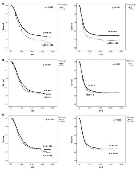 OS and DFS based on each inflammation-based prognostic score. (A) mGPS, (B) NLR, (C) PLR. OS, overall survival; DFS, disease-free survival; mGPS, modified Glasgow Prognostic Score; NLR, neutrophil-lymphocyte ratio; PLR, platelet-lymphocyte ratio.