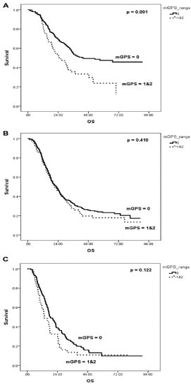 Among several inflammatory prognostic markers, CRP is the most commonly studied, while mGPS was revealed to have prognostic value in cancer, independent of tumor site [13,38]. In cancer patients, nutritional and functional decline are associated with a poorer outcome, while a chronic inflammatory state is known to be linked with anorexia–cachexia syndrome. An elevated mGPS is associated with increased weight loss, poor performance status, increased comorbidities, and increased pro-inflammatory and angiogenic cytokines, all of which can lead to a poor outcome. Furthermore, the immune response facilitates tumor progression, and tumor cells can produce inflammatory chemical mediators, assisting tumor growth [12,39]. The present study’s findings emphasize the relationship between systemic inflammation and survival in patients with pancreatic cancer as well as the value of mGPS as a significant prognostic factor.