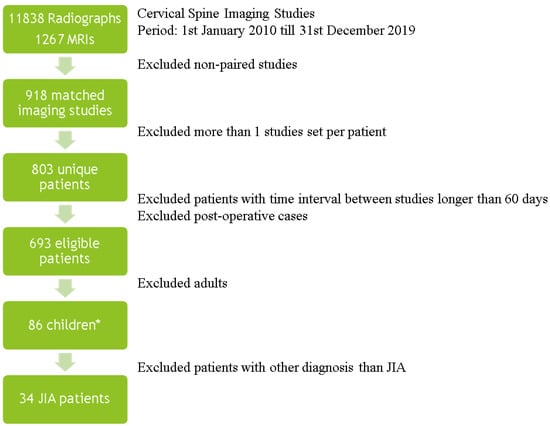 Lateral radiographs and MRI of the cervical spine performed in children clinically suspected of the cervical spine arthritis from 1 January 2010 to 31 December 2019 were assessed retrospectively. At single rheumatology center at this time period 11,838 radiographs and 1267 MRIs of the cervical spine both in adults and children were performed. From this group after pairing studies (at least one MRI and one radiograph per patient), excluding more than one study set per a patient, cases with time interval between studies exceeding 60 days, excluding adults, and finally excluding diagnoses other than JIA, the study group amounted to 34 patients. Fifty-two children had a diagnosis other than JIA, and age and sex matching served as the control group (38 patients). The Figure 1 show a general summary of an inclusion process.
