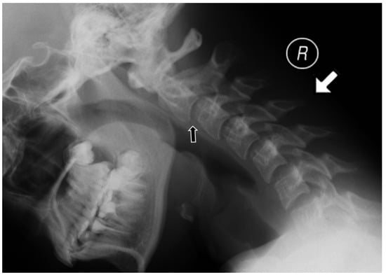 Lateral radiograph in flexion (indicated by white arrow) in a 13-year-old girl showing subaxial subluxation at C2/C3 level (black arrow).