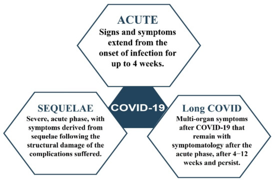 It is necessary to have clear concepts for the diagnosis, identification, treatment, management, and handling of LC patients to distinguish it from other pathologies related to SARS-CoV-2 infection. To date, it is possible to differentiate between acute COVID-19, sequelae derived from COVID-19 and LC (Figure 1). The patient with acute COVID-19 is one who manifests signs and symptoms of COVID-19 from the onset of infection, and which may extend up to 4 weeks after infection. The patient with sequelae of COVID-19, often referred to as post-COVID, may have a history of severe acute involvement by SARS-CoV-2 infection. Given the severity of the infection, these patients may have increased risk factors for hospital admission and that they present symptoms derived from sequelae following the structural damage of the complications suffered. The general features presented by this type of patient with sequelae are adult males (65–75 years) with associated comorbidities. All patients with sequelae have had access to RT-PCR for the diagnosis of the infection, when they received hospital care, and have received advanced health care and remained under follow-up in hospital consultations [14].