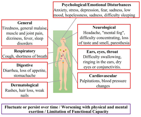 The symptoms and signs reported by people with LC are extremely numerous and varied (Figure 2) [63], which could perhaps be related to the different causes of the persistence of symptoms, which adds to the complexity of the syndrome in terms of its diagnosis, follow-up and its requirement for multidisciplinary health care [7]. Regarding the common symptomatology in LC patients, the following stand out: intermittent clinical presentation, exacerbation of symptoms with physical or mental effort and the so-called “mental fog”, which encompasses multiple symptoms associated with cognitive impairment such as memory loss, disorientation, interference in executive functions or problems in learning and concentration, and limitation of functional capacity [64].