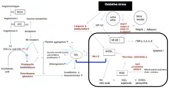 - Vasodilatory function, which is dependent on the nitric oxide (NO) bioavailability resulting from the balance between its synthesis and degradation. The synthesis depends on the substrate availability (l-arginine), as well as on the concentration of the competitive inhibitors for the endothelial nitric oxide synthase (eNOS)—asymmetric and symmetric dimethylarginine (ADMA and SDMA, respectively). The degradation of NO depends mostly on oxidative stress leading to the peroxynitrite formation (ONOO−). Peroxynitrite—as an extremely unstable compound—leads to the nitration and S-nitrosylation of numerous proteins, and the nitrotyrosine (N-Tyr) is a marker of nitrosative stress. The bioavailability of nitric oxide was assessed also at the functional level by measuring the flow-mediated vasodilation (FMD) of the brachial artery.