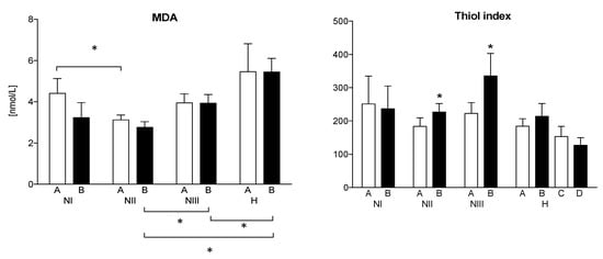 - Oxidative stress, measured as the lipid peroxidation, where malonyldialdehyde (MDA) is a marker, and nitrosative stress, as described above. Moreover, the antioxidative glutathione capacity was measured and expressed as the reduced-to-oxidized glutathione ratio (thiol index).