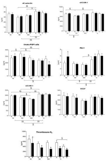 3.6.3. Endothelial Thrombogenic Function—The PAI-1, 6-keto-PGF1 Alpha, and Thromboxane B6 Levels