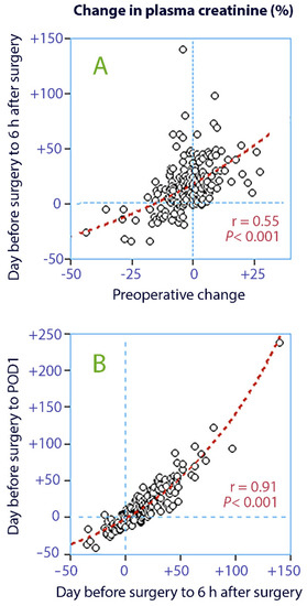 Linear correlations between changes in plasma creatinine; (A) the preoperative change vs. the change from the day before surgery to 6 h after surgery; (B) the further change to the first postoperative day (POD1).
