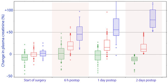 Perioperative trajectory of plasma creatinine based on whether the final postoperative value represented a decrease in plasma creatinine values (green), a moderate increase (0–50%; red) or a substantial increase (>50%, blue) as compared to the concentration measured on the day before surgery. A statistically significant difference between these groups had occurred already before surgery was initiated, i.e., from the day before the surgery to the onset of surgery.