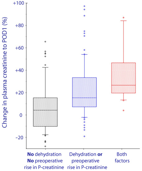 Change in plasma creatinine (as a percentage) from the day before surgery to the first day after surgery, depending on whether patients were dehydrated and/or showed an increase in plasma creatinine from the day before surgery to just before the surgery started. The box shows the 25th, 50th, and 75th percentiles and the error bars indicate the 10th and 90th percentiles.
