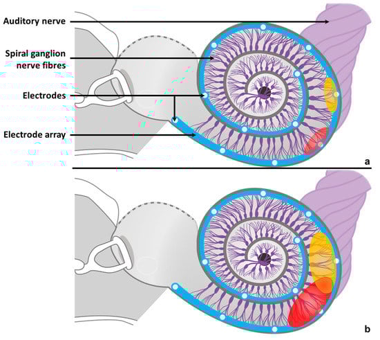 Examples of interactions induced by the intracochlear spread of current from the cochlear implant. Whenever the cochlear implant’s electrode array delivers electrical stimulations (red and yellow areas), the current spreads from each activated electrode to the surrounding neural tissue. If the spread is limited (a), each electrode will stimulate a distinct part of the neural tissue and thus evoke its own auditory sensation independent of the others. For a larger current spread (b), a shared part of neural tissue is stimulated by adjacent electrodes at the same time with a higher risk of channel interaction (orange area), and distinguishing sounds evoked by the interacting electrodes may become more difficult.