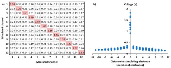 Example of the voltage matrix, in V (a) of one subject (S35) collected during impedance field telemetry measurement with the MAESTRO software (MED-EL GmbH, Innsbruck, Austria). Measurement of electrodes’ impedance consists in activating one electrode at a time and then measuring the voltage detected by every electrode of the cochlear implant array. The resulting voltages are plotted as a function of the distance between the stimulating and the recording electrode expressed in number of electrodes (b).