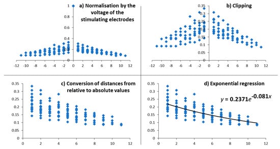 Impedances were recorded for each electrode using the clinical software (Maestro) and interface (MAX) provided by the CI manufacturer (MED-EL, Innsbruck, Austria). As some electrodes were inactivated, corresponding data were removed from the dataset, only significant values remained. For each stimulating electrode, the voltages of all active electrodes (including the stimulating one) were normalised by the voltage measured at the level of the stimulating electrode (Figure 3a). The normalised voltages of the stimulating electrodes were removed (Figure 3b). We converted relative distances between electrodes (in number of electrodes) to absolute values (Figure 3c). Then, an exponential regression was computed to fit the normalised voltages as a function of the absolute distance to the stimulating electrodes (Figure 3d).