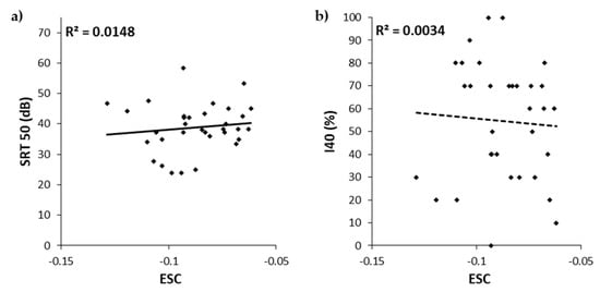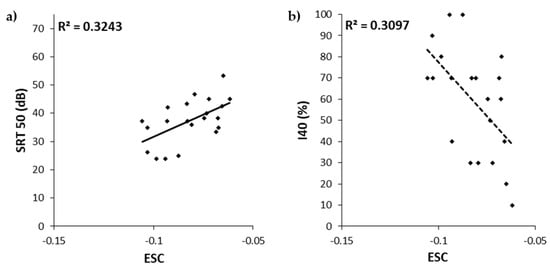 A moderate significant correlation was observed between both ESC and SRT50 (r = 0.569, p = 0.007), and between ESC and I40 (r = −0.557, p = 0.009; Figure 5). These results show that as the ESC decreased, SRT50 decreased and I40 increased. The ESC variability was found to explain 32% and 31% of the SRT50 and I40 variability, respectively.
