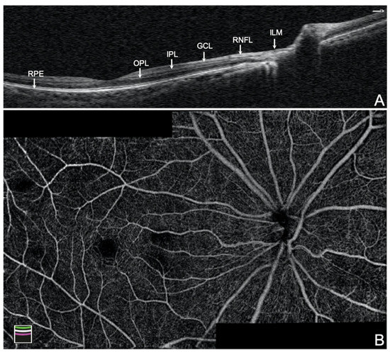 - Campbell, J.P.; Zhang, M.; Hwang, T.S.; Bailey, S.T.; Wilson, D.J.; Jia, Y.; Huang, D. Detailed vascular anatomy of the human retina by projection-resolved optical coherence tomography angiography. Sci. Rep. 2017, 7, 42201. [Google Scholar] [CrossRef] [PubMed]