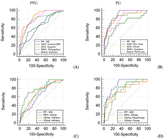 Receiver operating characteristic curve of most sensitive parameters in each category. Area under the curve (AUC) of the most sensitive parameters from Pulsar perimetry and structural parameters of OCT and OCTA in PPG (A) and PG (B). Area under the curve (AUC) of the most sensitive parameters from Pulsar perimetry and capillary parameters of OCTA in PPG (C) and PG (D). PP = Pulsar perimetry; MD = mean defect; ONH = optic nerve head; CDR = cup–disc ratio; GCC = ganglion cell complex; RNFL = retinal nerve fiber layer; RPC = radial peripapillary capillary; VDms = vessel density of macular superficial vascular complex; VDmd = vessel density of macular deep vascular complex; SupHemi = superior-hemi; InfHemi = inferior-hemi.