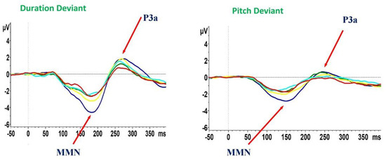- Salisbury, D.F.; Shafer, A.R.; Murphy, T.K.; Haigh, S.M.; Coffman, B.A. Pitch and Duration Mismatch Negativity and Heschl’s Gyrus Volume in First-Episode Schizophrenia-Spectrum Individuals. Clin. EEG Neurosci. 2020, 51, 359–364. [Google Scholar] [CrossRef] [PubMed]
