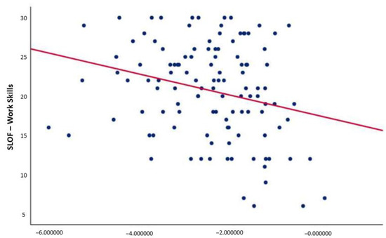 Correlation analyses revealed a negative relationship between pMMN amplitude and the “work skills” domain of the SLOF scale (r = −0.257; p = 0.005) (Figure 2). This correlation remained significant after controlling for positive, negative, and disorganized symptoms; depression; neurocognition; and global parkinsonism. No correlation was found between P3a and real-life functioning in SCZ.