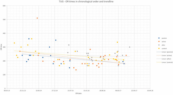 OR times of TUG flap procedures in chronological order and trendlines of each study group. x-axis: date of surgery; y-axis: OR time in minutes.