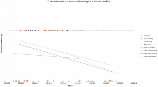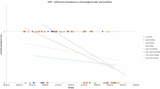 OR times did not differ significantly among study groups and are depicted in Table 2 for DIEP and Table 3 for TUG flaps, as well as in chronological order with trend in Figure 1 and Figure 2. Complication rates for DIEP and TUG flap procedures are shown in Table 2 and Table 3, respectively. Half of the OR time was spent with the dissection of perforators, one-quarter for anastomosis, and the remaining quarter for insetting of the flap. Complete flap loss was seen in two cases—one TUG of the “active training” group and one DIEP of the “after training” group. Partial flap loss was seen in four cases—one DIEP and one TUG flap in each “passive training” group, one DIEP flap in the “after training” group, and one TUG in the “no training” group. Among study groups, vascular revisions, other complications, and secondary procedures did not reveal any statistically significant differences. For TUG, refinement procedures were necessary in 65%, 41%, 36%, and 56% of cases in the passive, active, after-training, and no-training groups, respectively. In the DIEP groups, patients underwent refinement procedures in 71%, 63%, 49%, and 44% of cases in the passive, active, after-training, and no-training groups, respectively. Number of refinement procedures are listed in Table 2 and Table 3. Refinement procedures in chronological order with trend line are shown in Figure 3 and Figure 4. Of note, breast reduction/mastopexy of the contralateral side and reconstruction of the nipple areola complex were always done in a second procedure and counted as a refinement procedure.