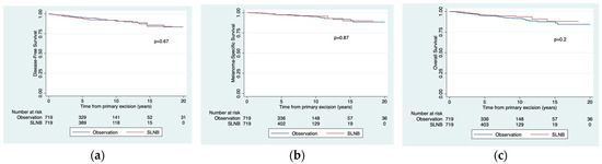 The main limitation of this study is its retrospective design. The groups may not have been properly balanced as not all potential confounders were considered (e.g., comorbidities and performance status). Our study may also be underpowered, as it has been calculated that 6500 patients would be needed to detect a protective effect for SLNB using a similar design to the MSLT-1, based on a power of 90%, a follow-up period of 5 years, and an estimated hazard ratio of 0.8 for SLNB [26]. Furthermore, we did not specifically analyze time to recurrence at regional lymph nodes; the only expected benefit of the SLNB according to previous studies focused on thicker tumors.