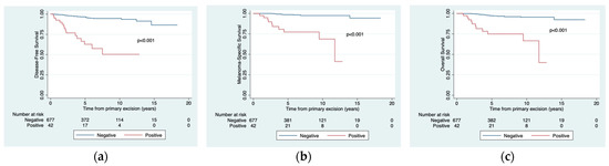 The 5- and 10-year MSS rates for SLN-negative and -positive patients were 98.5% vs. 77.3% (p < 0.001) and 97.3% vs. 68.7% (p < 0.001), respectively. The corresponding rates for the other survival categories were 96.6% vs. 60.9% (p < 0.001) and 94.6% vs 48.9% (p < 0.001) for DFS and 97.3% vs. 78.9% (p < 0.001) and 95.5% vs. 66.6% (p < 0.001) for OS (Figure 3).