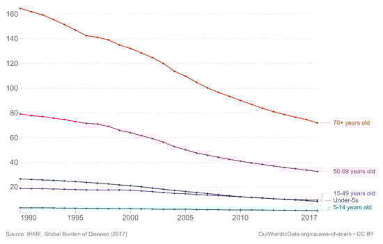 Death rate from tuberculosis by age in the World, 1990 to 2017 [8].