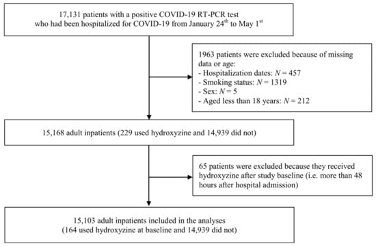 Of the 17,131 patients hospitalized for laboratory-confirmed COVID-19, 1963 patients (11.5%) were excluded because of missing data or their young age (i.e., less than 18 years old of age). Of the remaining 15,168 adult patients, 65 patients (0.4%) were excluded because they received hydroxyzine after more than 48 h after hospital admission. Of the remaining 15,103 adult inpatients, 164 (1.1%) used hydroxyzine within the first 48 h of hospitalization, with a mean delay between hospital admission and first prescription of 0.9 days (SD = 0.6; interquartile range (IQR) = 0–1.5)), at a median daily dose at baseline of 25.0 mg (SD = 29.5, IQR = 25.0–50.0 mg) (Figure 1).