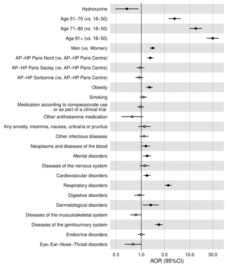 Among patients receiving hydroxyzine, death occurred in 18 patients (11.0%), while 1571 non-exposed patients (10.5%) had this outcome (Table 2). Despite the older age and the overall greater medical severity of patients receiving hydroxyzine at baseline than those who did not, the univariate unadjusted association between hydroxyzine use and mortality was not statistically significant (OR, 1.05, 95%CI, 0.64–1.72, p = 0.849) (Table 2). When taking into account differences in baseline characteristics between exposed and non-exposed patients, the multivariable logistic regression adjusting for age, sex, hospital, obesity, current smoking status, any medication prescribed according to compassionate use or as part of a clinical trial, any other antihistamine medication, and all medical conditions showed that hydroxyzine use was significantly associated with reduced mortality (AOR, 0.51; 95%CI, 0.29–0.88, p = 0.016) (Table 2; Figure 2).