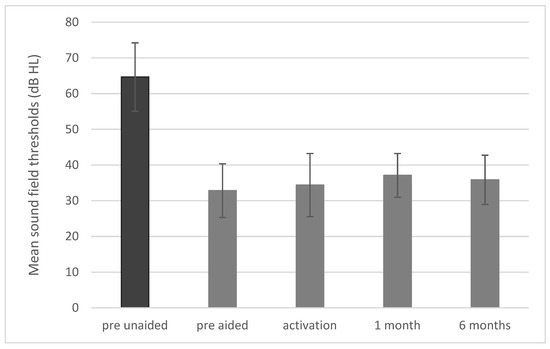 Sound field thresholds. All differences between pre-unaided and all other conditions are statistically significant at p < 0.001. The bars represent mean scores, the error bars are standard deviations.