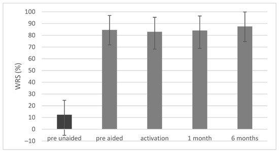 Before implantation the mean word recognition score (WRS) measured via headphones was 7.3% (SD = 17.6). Unaided, the scores were 12.1% (SD = 17.2) and aided (in the simulation) 84.3% (SD = 12.5). After surgery a statistically significant improvement was observed (F = 122.19; p < 0.001; e2 = 0.85). Upon activation the mean WRS was 82.7% (SD = 14.5); 1 month later it was83.9% (SD = 15.0) and after 6 months it was 87.3% (SD = 12.6) (Figure 7).