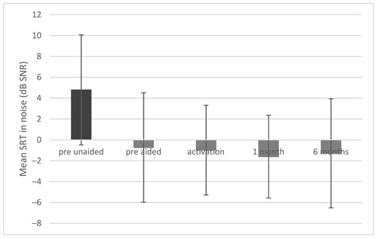 Before implantation the mean speech reception threshold (SRT) was 4.79 dB SNR (SD = 5.28) unaided and −0.73 dB SNR (SD = 5.24) aided (in the simulation). After surgery a statistically significant improvement was observed (F = 10.90; p < 0.001; e2 = 0.35). The mean SRT was −0.98 dB SNR (SD = 4.30) upon activation, −1.61 dB SNR (SD = 3.97) after 1 month, and −1.29 dB SNR (SD = 5.23) after 6 months (Figure 8).
