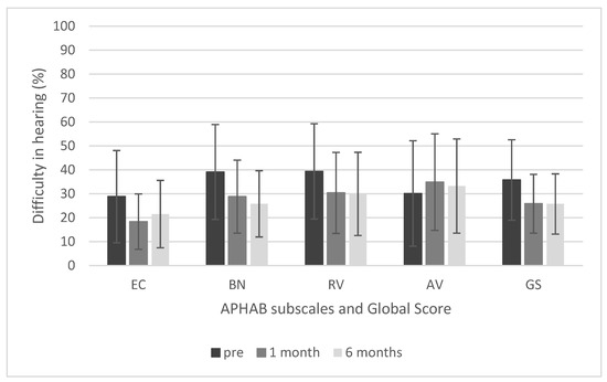 Results of APHAB questionnaire.EC, Ease of Communication; BN, Background Noise; RV, Reverberation; AV, Aversiveness; GS, global score. The differences in the EC, BN, and RV subscales are statistically significant at p < 0.05, but the difference in the AV subscale is not. The bars represent mean scores, the error bars represent standard deviations.
