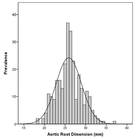 The mean aortic root diameter was 25.9 ± 3.1 mm (Figure 1) and 18 of the 281 (6.4%) of the athletes had aortic root dilation. Athletes had a significantly higher aortic root diameter when compared to a normal reference cohort (athletes: 25.8 mm vs. reference: 23.8 mm; p < 0.001) (Figure 2), and there was no association with training hours (p = 0.212).