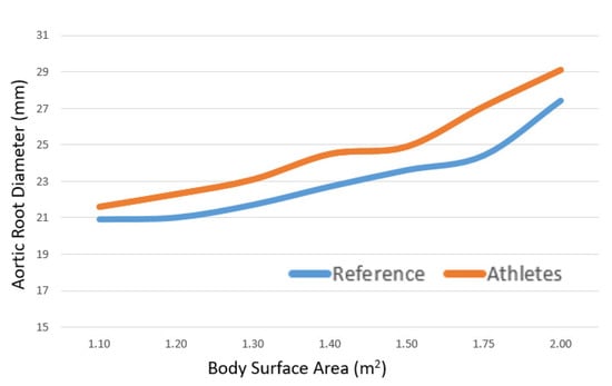 Cross-sectional Aortic Root Dimensions according to body surface area displayed for the athletes and normal healthy reference.