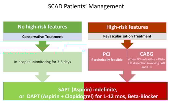 Clinical features include clinical status, persistent chest pain with ongoing or persistent ischemia, hemodynamic instability, or ventricular arrhythmias, while high-risk procedural features are multivessel disease with proximal segments involvement, left main dissection, and distal flow, described by Thrombolysis in Myocardial Infarction (TIMI) grade [,,]. Some authors suggest that adequate distal flow (i.e., TIMI 2–3) does not require PCI [].