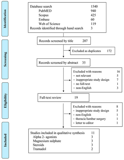 The medical subject headings MeSH terms “spine surgery”, “discectomy”, “laminectomy”, “local anesthetics”, “infiltration”, “pain”, “analgesia”, “analgesics”, “opioids”, “ketamine”, “tramadol”, “dexmedetomidine”, “clonidine”, “steroids”, “NSAIDs”, “non-steroidal anti-inflammatory drug”, “COX-2”, or “magnesium” with “AND” and “OR” as Boolean terms were applied into the databases to retrieve articles relevant to the objectives of the current review. An ultimate check of all databases was carried out on 2 November 2021.